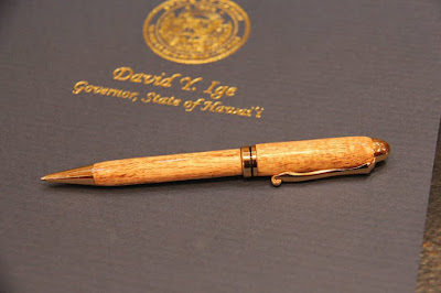 | Gov. Ige used a pen made by a Kulani inmate to sign a bill allowing sale of such products to the public. Photo from Gov. Ige's Office |