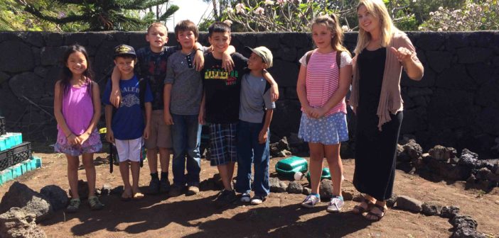 | Ka`u Learning Academy students, with teacher Audra Zook at their Peaceful Garden site. Photo from Good for All News |