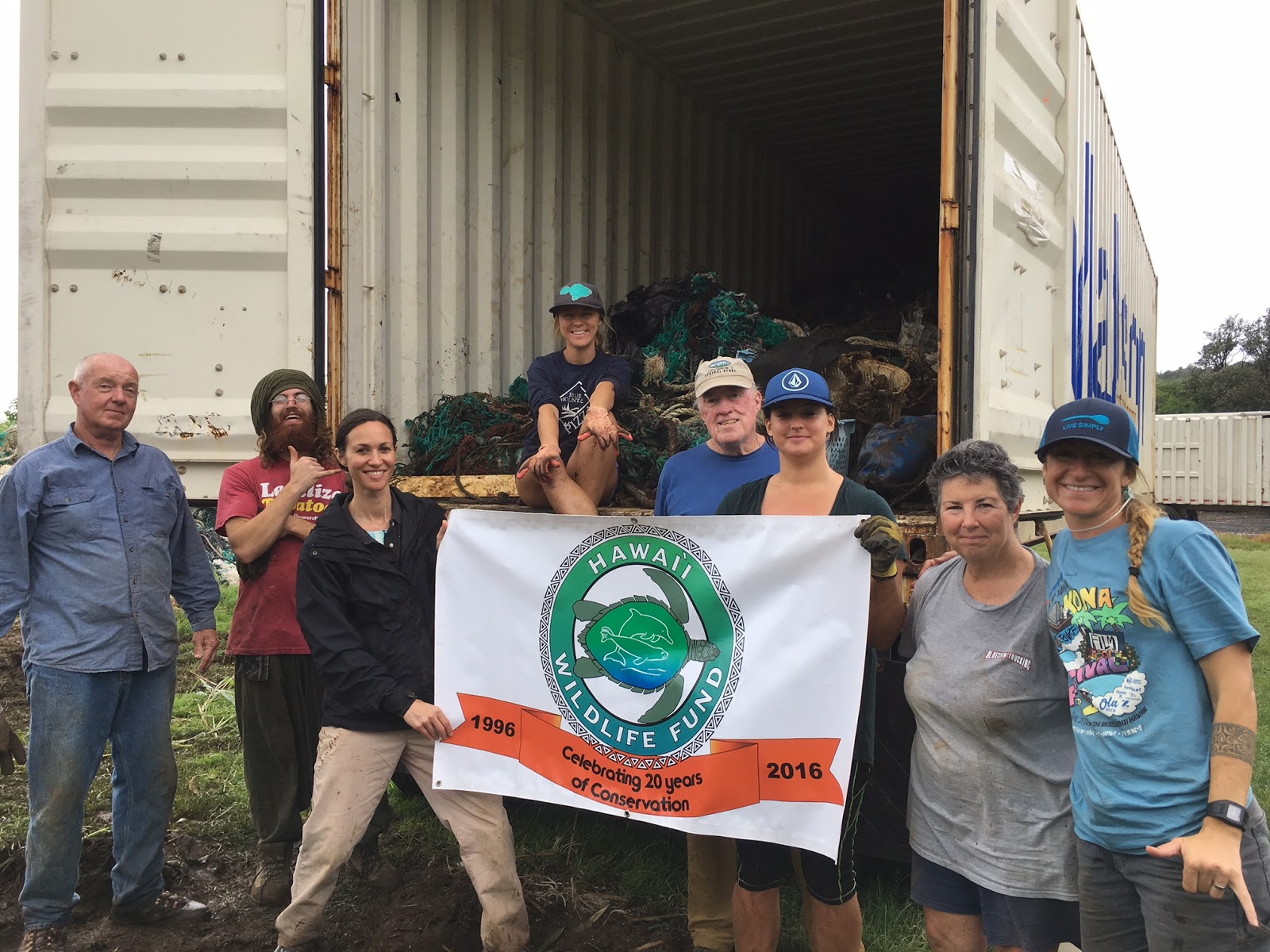 | Hawaiʻi Wildlife Fund volunteers in front of the Matson container used to haul out 11.6 tons of marine debris on March 4. Photos from Hawaiʻi Wildlife Fund |