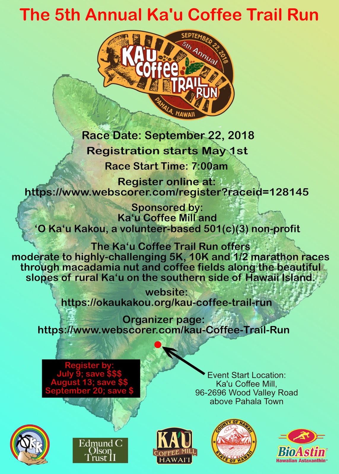 5th Annual Ka`ū Coffee Trail Run Registration Open, online at webscorer.com/register?raceid=128145, Fees, before Aug 13: 5K, $30/person; 10K, $40/person; and 1/2 Marathon, $50/person. After Aug 13: 5K, $35/person; 10K, $45/person; and 1/2 Marathon, $55/person. Race Day Sat, Sept 22, 7 a.m.; begins and ends at Ka`ū Coffee Mill, kaucoffeemill.com. Event organizers: `O Ka`ū Kākou, okaukakou.org.
