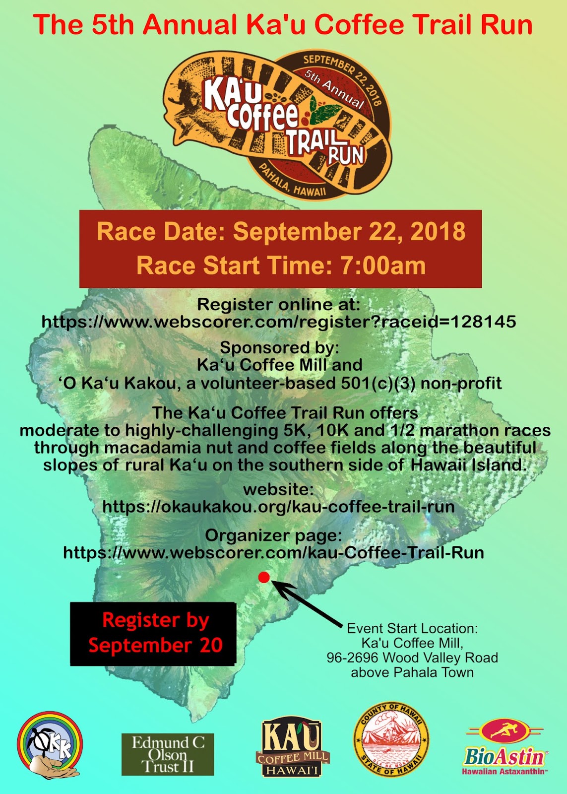 5th Annual Kaʻū Coffee Trail Run Registration Open, online at webscorer.com/register?raceid=128145. Fees through Sept. 10: 5K, $35/person; 10K, $45/person; and 1/2 Marathon, $55/person. Fees Sept. 11-20: 5K, $55/person; 10K, $65/person; and 1/2 Marathon, $75/person. On Race Day, $75 per person, any race. Race Day is Sat., Sept. 22, 7 a.m.; begins and ends at Kaʻū Coffee Mill, kaucoffeemill.com. Event organizers: ʻO Kaʻū Kākou, okaukakou.org.